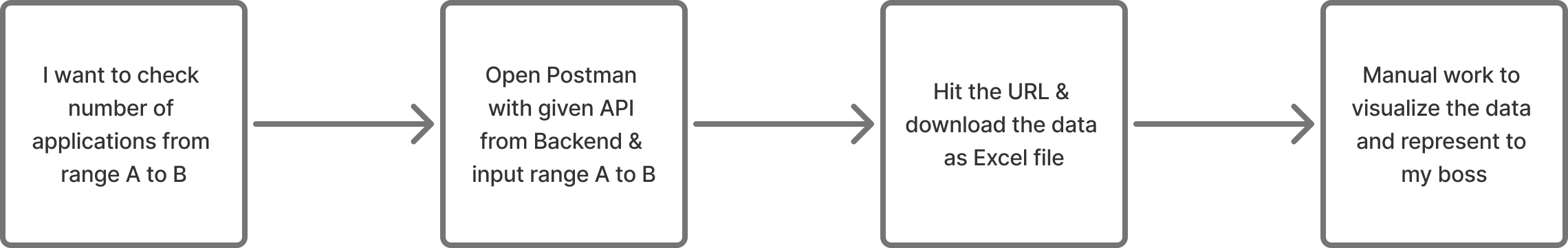 The goal was clear: "Represent the number of applications from Date A to Date B with key takeaways to my boss". But the reality was absurdly technical for a small process like that. I didn't have a dashboard and needed to act like a Product Operator: