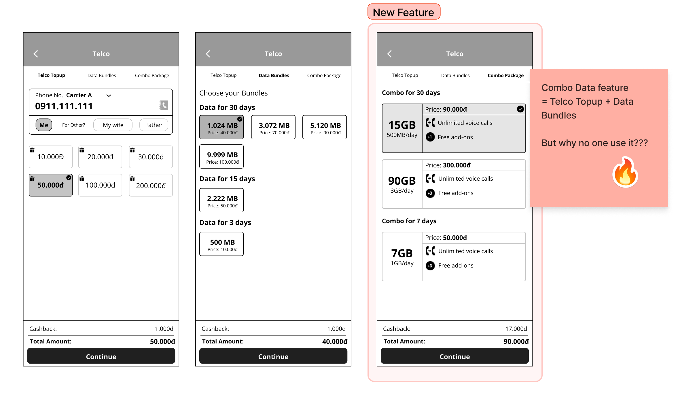 I remember specifically working on a Combo Data feature for an E-Wallet ecosystem. The hypothesis was clear: we already had high revenue from Telco top-ups and Data bundles separately. The logic was that combining them into a package with free voice calls would naturally uplift the revenue.