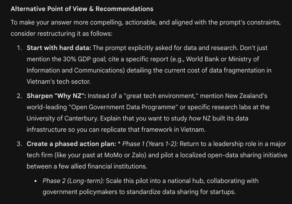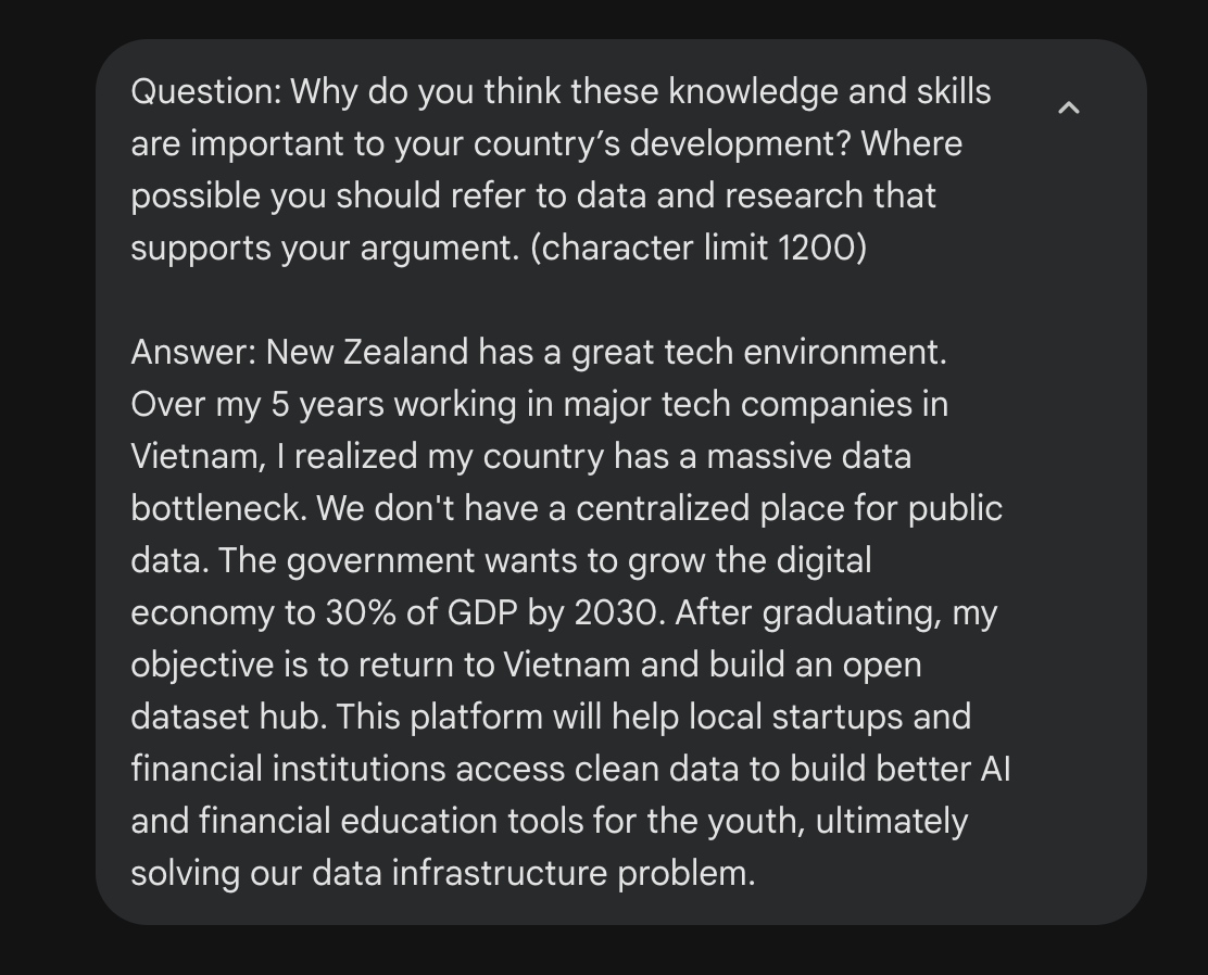 - Góc độ từ Hội đồng Học bổng Manaaki: Ông bạn AI này sẽ làm rõ mục tiêu "Vì sao bạn chọn học ở New Zealand thay vì học ở Việt Nam hay các quốc gia khác". Bên cạnh đó, sẽ kiểm tra bạn có thực sự cam kết với sự phát triển kinh tế và xã hội của Việt Nam hay không. Đặc biệt, kết hợp với kinh nghiệm làm việc trong quá khứ của bạn để kiểm tra sự liên quan mật thiết đến ngành học dự kiến và kế hoạch hành động khi về nước có khả thi hay không.