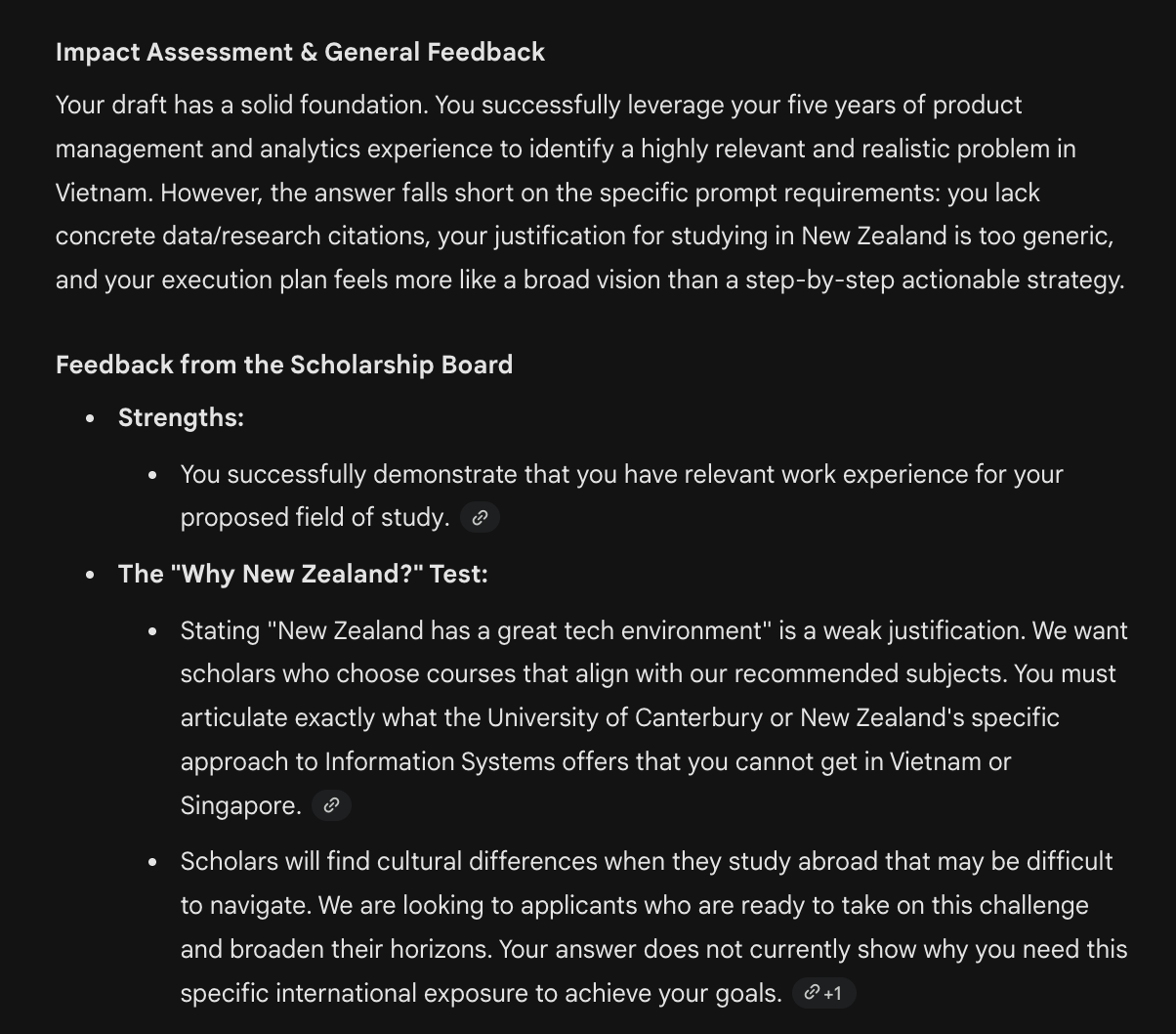 Là người được nhận học bổng & cũng muốn tạo gì đó hữu ích đến xung quanh, nên mình tạo nhanh bài viết này để hướng dẫn mọi người cách ứng dụng Gemini Gems (trợ lý ảo của Google) để thiết lập bộ công cụ hỗ trợ đánh giá các phản hồi của bạn cho những câu hỏi trong bài luận nhằm giúp bạn tìm ra lỗ hổng trong tư duy và cải thiện hồ sơ.