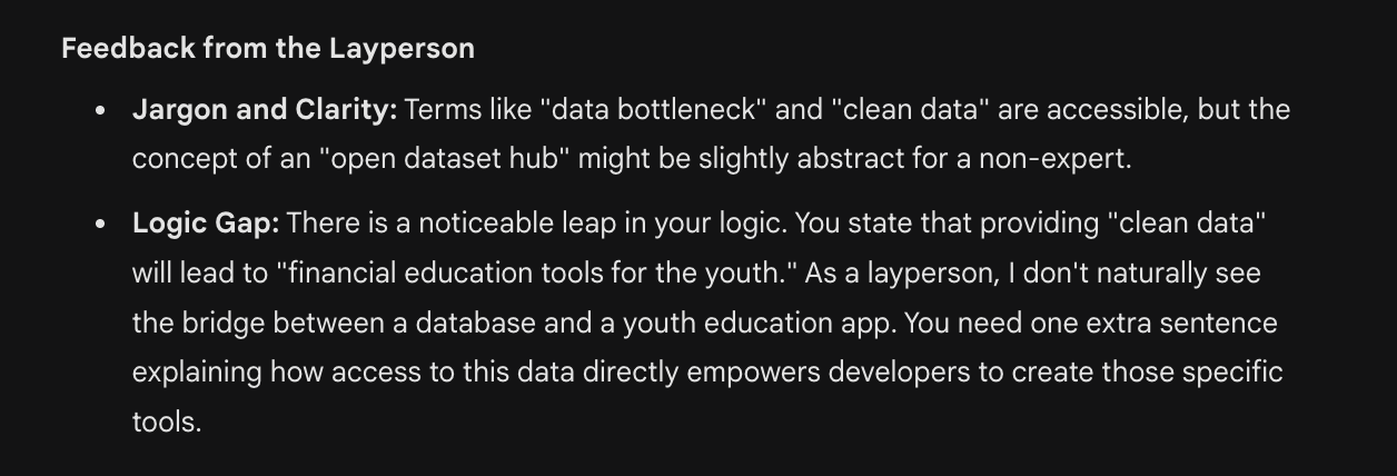 Read assuming no domain knowledge. Identify jargon, complex terms, or confusing logic. Assess clarity and simplicity.