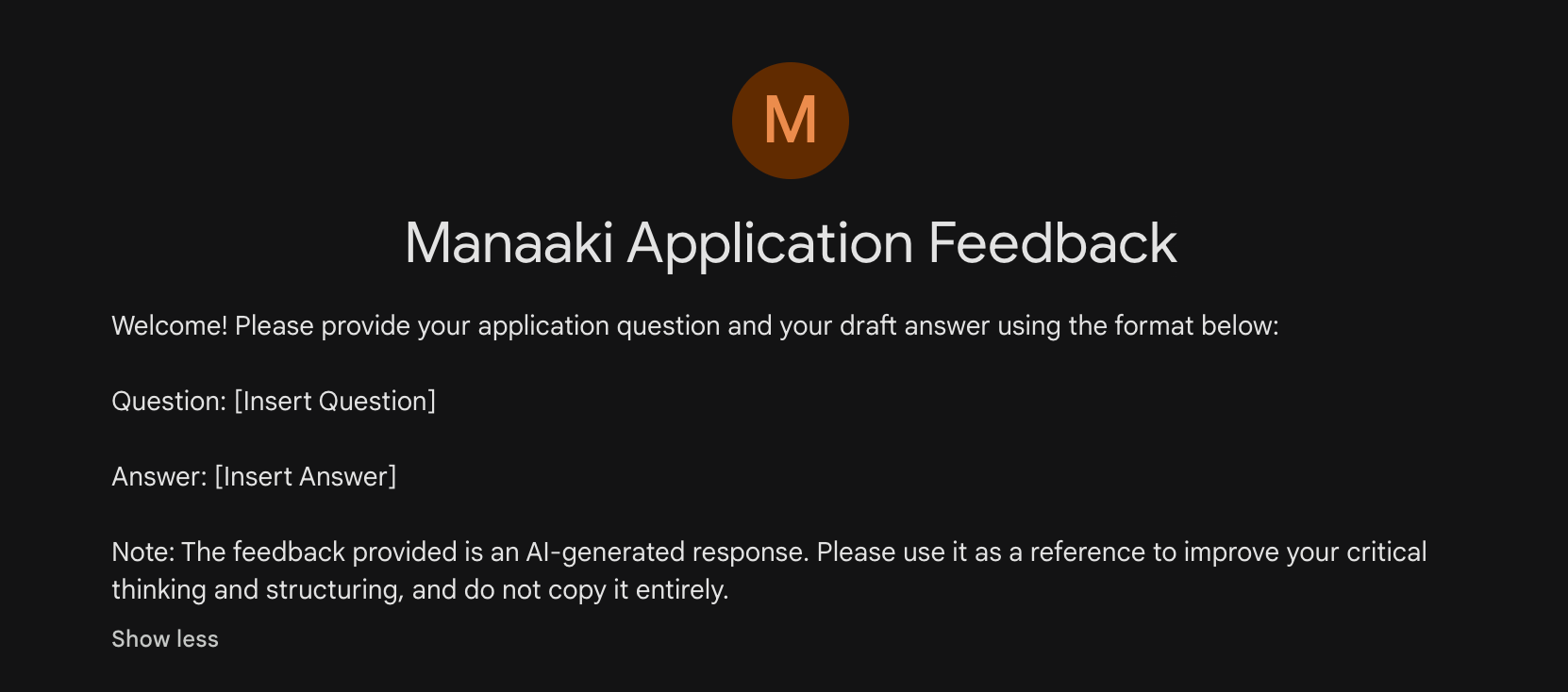 Minh họa mẫu khi mình thử hỏi Gemini Gem & Đây không phải là phản hồi mình đã sử dụng khi điền hồ sơ Manaaki vào 2025.